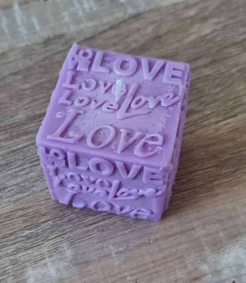 Imaginons une bougie captivante en forme de cube mesurant 5 cm de côté et pesant 96 grammes. Sa surface légèrement satinée capte la lumière d'une manière délicate, en créant un jeu d'ombres et de lumières. Sur chaque face du cube, des mots "Love" sont scultés tout en relief léger. La bougie peut etre parfumée d'une fragrance douce et envoûtante, mêlant des notes de rose ou de vanille, créant une atmosphère romantique et apaisante.