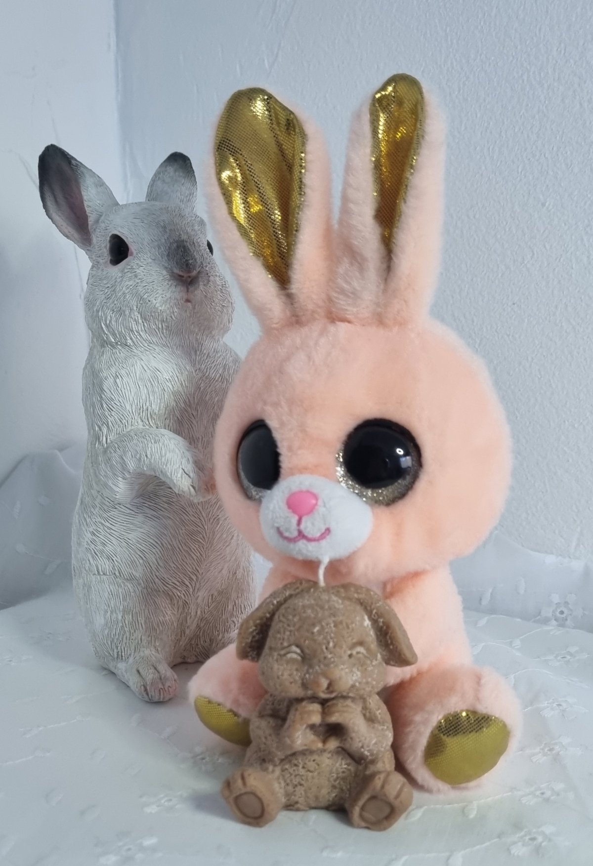 La cire de cette bougie pourrait être d'une couleur douce et chaleureuse, comme un beige crème ou un rose pâle, accentuant l’aspect câlin et réconfortant du lapin.