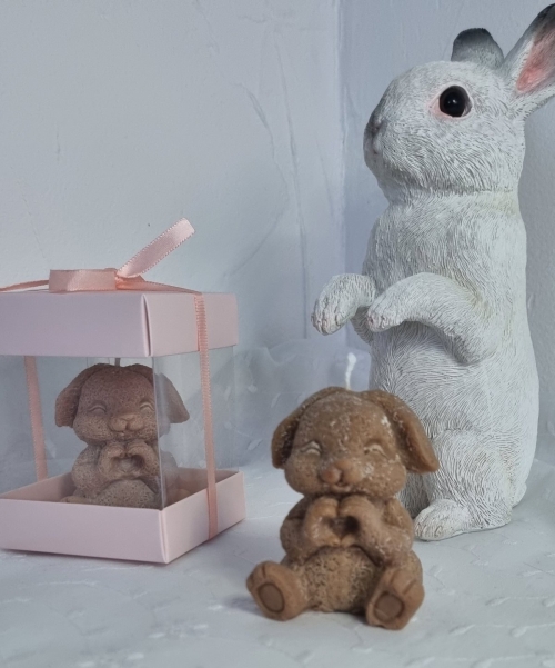 Adorable bougie de 70g en forme de lapin, sculptée avec une grande attention. Le lapin, tout mignon, est assis avec ses petites pattes devant lui, et ses deux mains (ou plutôt, ses pattes avant) forment délicatement un cœur, comme s'il offrait son amour avec une innocence pure. Les traits de son visage sont doux, avec un sourire apaisant.
