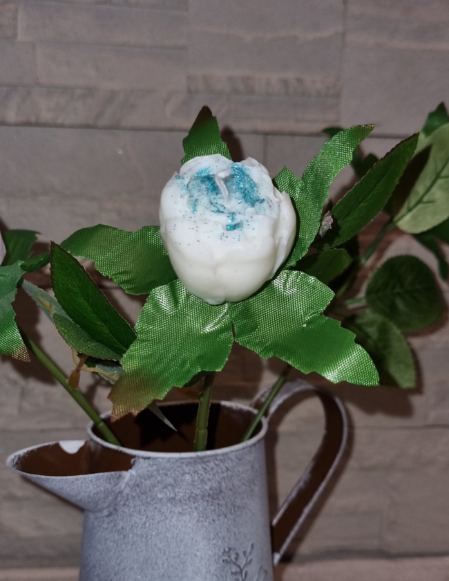Délicate et romantique, cette bougie en forme de rose montée sur une tige artificielle est une véritable ode à l’élégance florale.