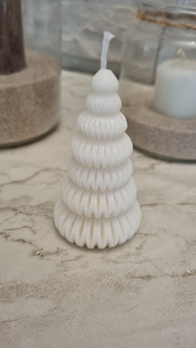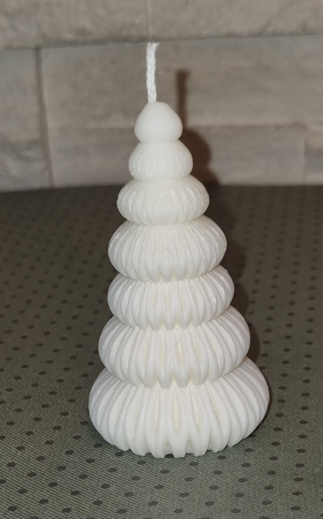 Ce sapin de cire se distingue par son design original, évoquant un empilement délicat de couronnes festonnées qui s’élèvent en douceur jusqu’à la pointe.